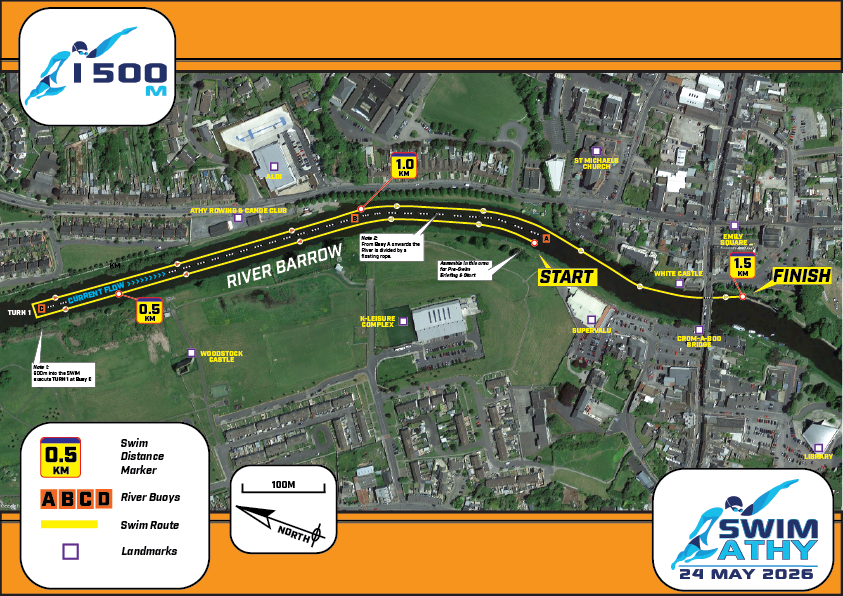 The 1500m swim consists of a 500m upstream section followed by a 1000m downstream section.